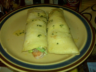 OK, they weren't horrible, but wow, do I need work. I followed a crepe recipe online (pick yours or browse, cause mine obviously I didn't do right) and decided on zucchini and shrimp for Mikealicious, and zucchini and mushroom for me. Sauteed them up with some butter and DID I MENTION I love that man enough to have peeled and de-ickified 10 cold, smelly shrimp? Yeah, that's right.